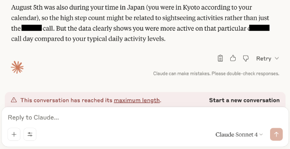 This includes things like highlighting activity trends (from Apple Health) alongside a look into my calendar. I could combine this further with things like my infrequent journal, or other RSS feeds and activity to discover patterns between them. In the previous example, I appreciated the LLM noticing I was on holiday based on a calendar event while analyzing step count, and imputing that this probably had an exceptional effect on the numbers for that period.